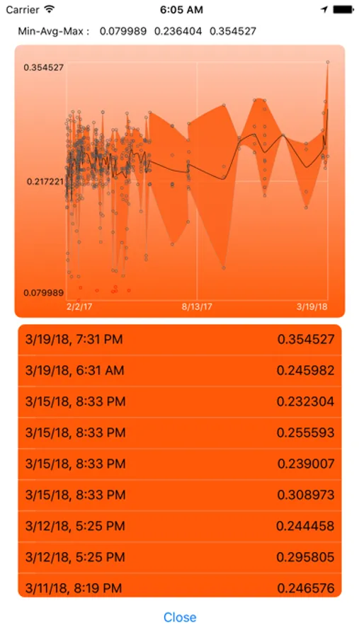 Reaction times are stored for later analysis. The free version gives you 5 attempts before issuing a request to buy - just enough to know how it works. Unlocking is available as an in-app purchase. You can force-quit te app to get another 5 attempts, but past attempts will no longer show in the history table and graph. They are kept on file though for when one should choose to buy later.