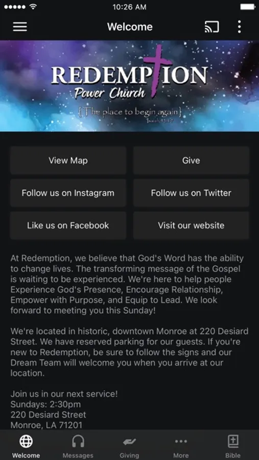 The Redemption Power Church App was created with the Subsplash App Platform.