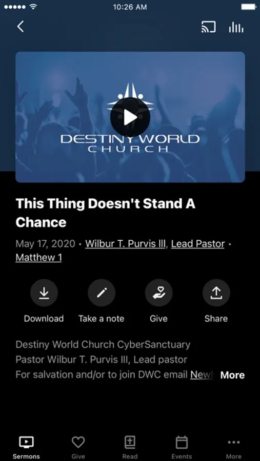 Everything found on the Destiny World Church App can easily shared with friends and family via Twitter, Facebook, or email.