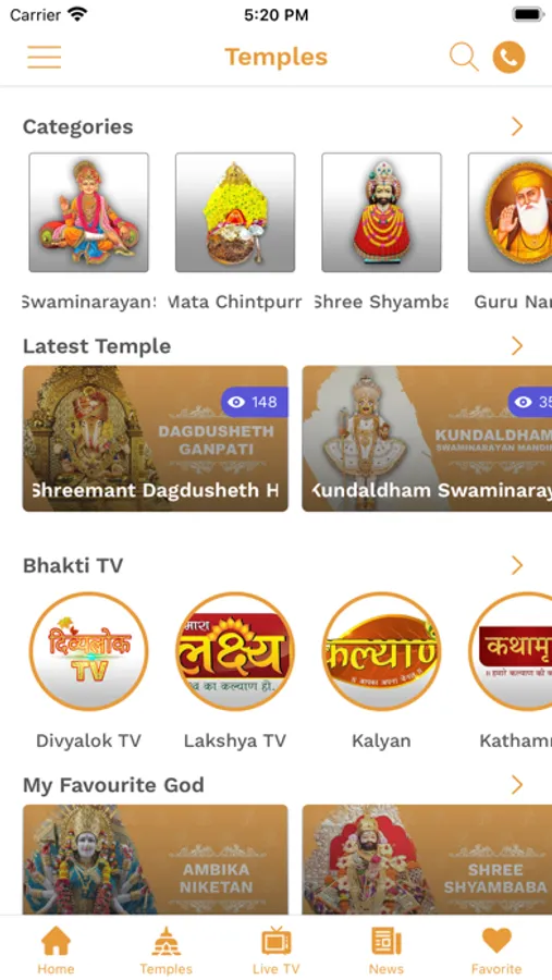 FAVORITES: Save your favorite temples for live darshan daily.