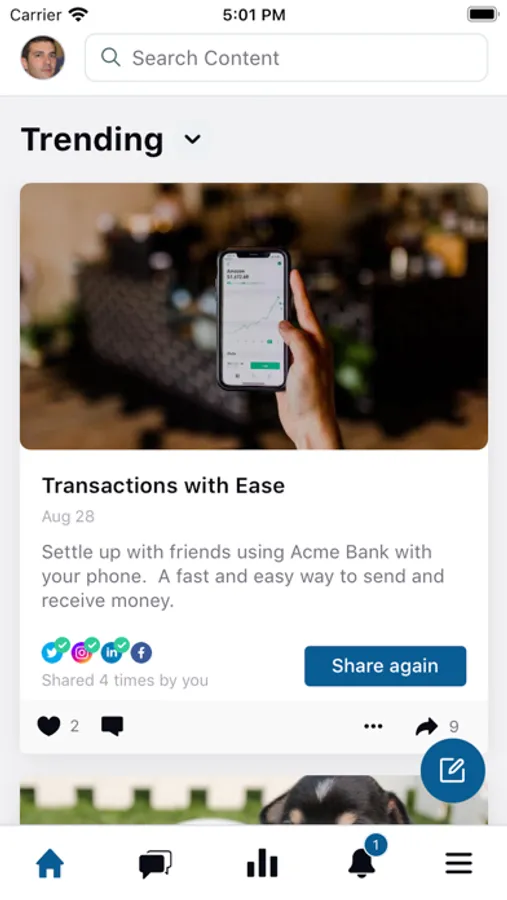 Sprinklr Extend is your new home for company content and employee advocacy. With easy access to the latest blog posts, company news, and more, you'll be able to easily share engaging content with your social networks. You will also have opportunities to upload your own content to be featured on the site.