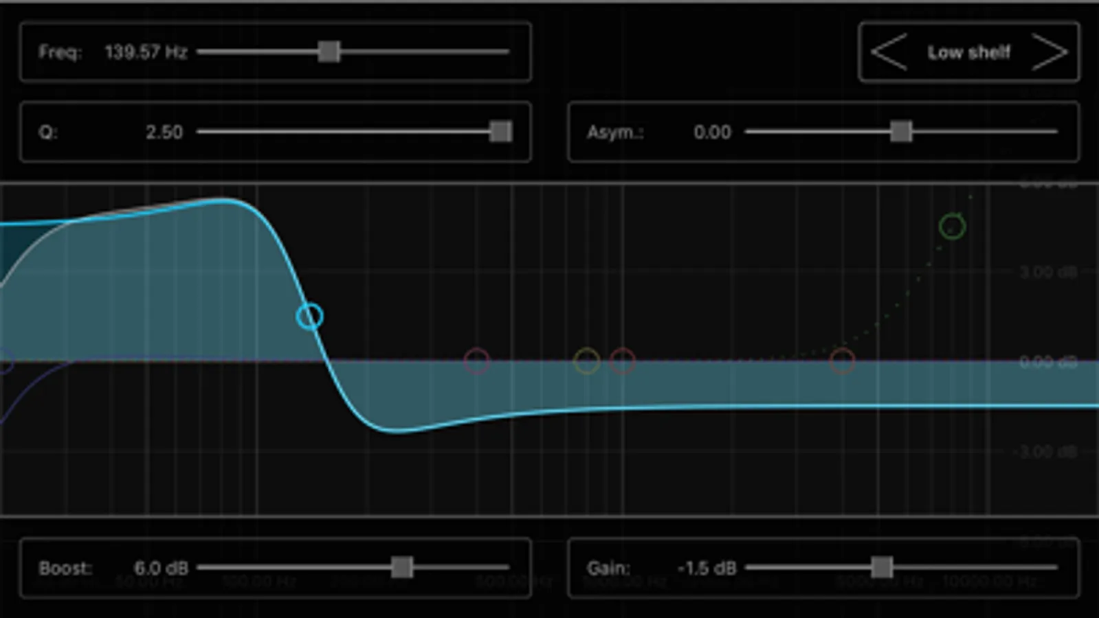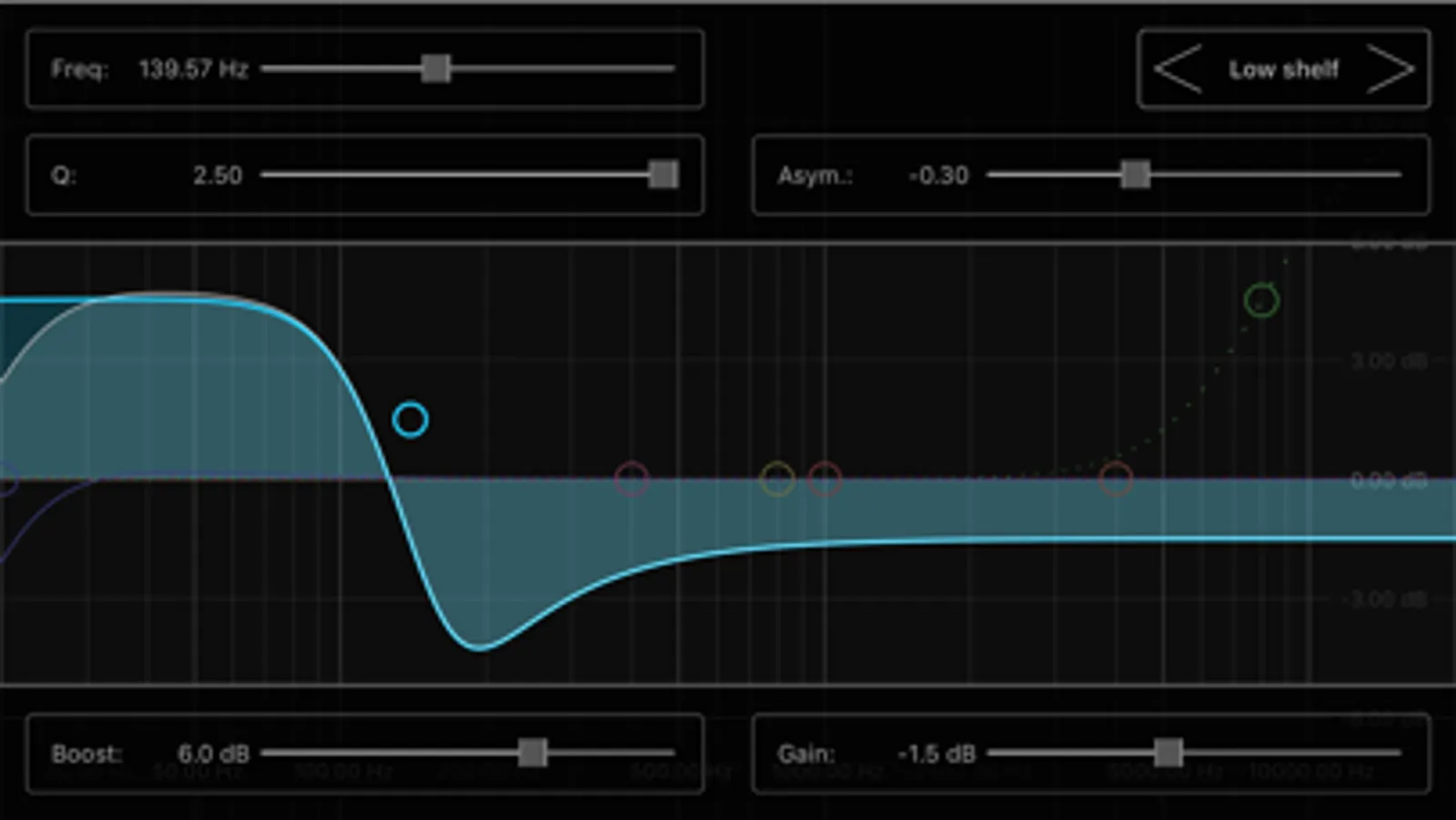 * The (high and low) shelving bands have a unique "asymmetry" parameter which allows finer control of the frequency curve around the edge frequency. This new feature is especially powerful for balancing frequency content of complementary sounds such as bass drum/bass guitar or different vocals and harmony instruments. For example, use it to "thin out" your bass drum in the lower mids/upper bass range, making room for your bass guitar... (Please compare the respective screenshots.)