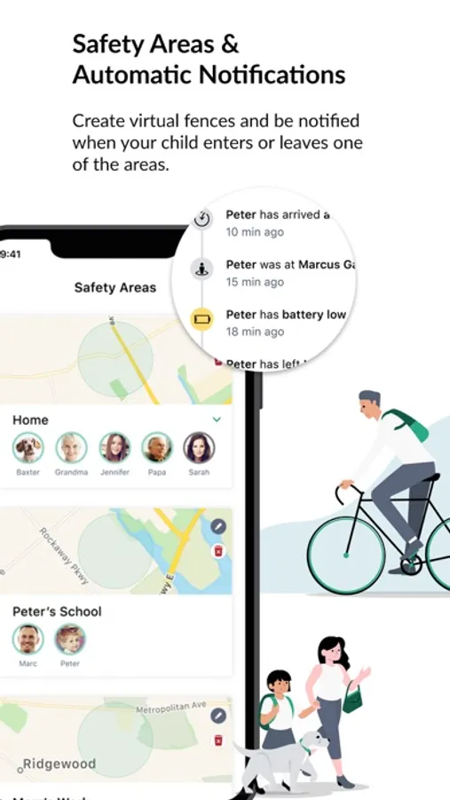 • Create virtual fences around areas you designate and receive automatic notifications when a child enters or leaves the area.