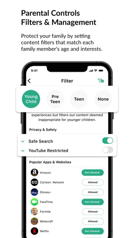 • Protect children from inappropriate digital content by setting online content filters that match each child's age and interests.