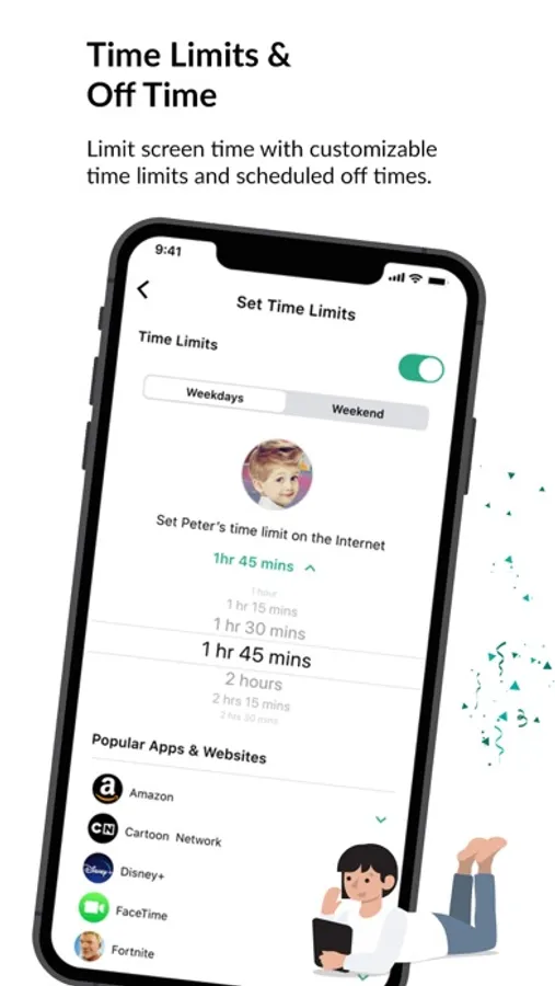 • Proactively manage the time children spend on their phone and restrict app-specific or total device usage.