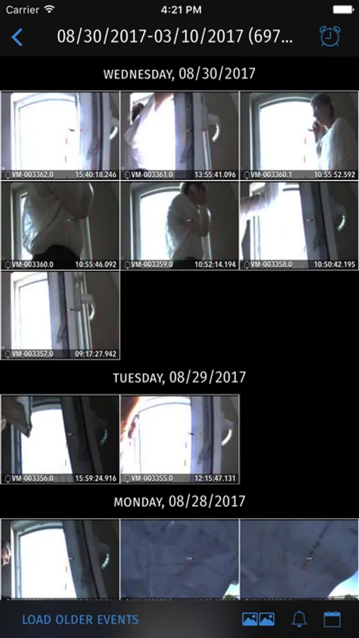 Access the camera-stored alarm images and clips. Scrub to the individual pictures to inspect them in highest quality.