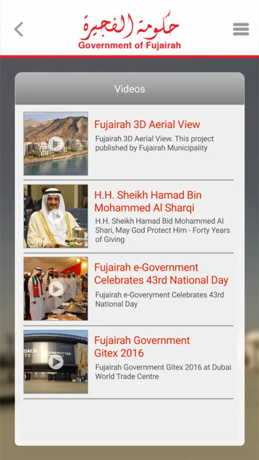 "الفجيرة" تطبيق المحمول لحكومة الفجيرة الذي يقدم معلومات واسعة من مواضيع وقضايا مرتبطة بإمارة الفجيرة بطريقة موجزة.
