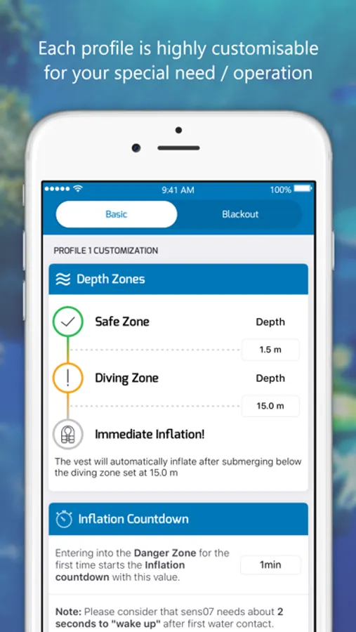 The safety parameters of the sens07vest can be defined using this app and transferred wirelessly to the device.