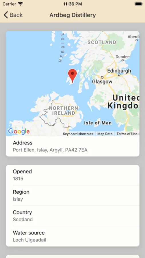 - Distillery location shown on a map