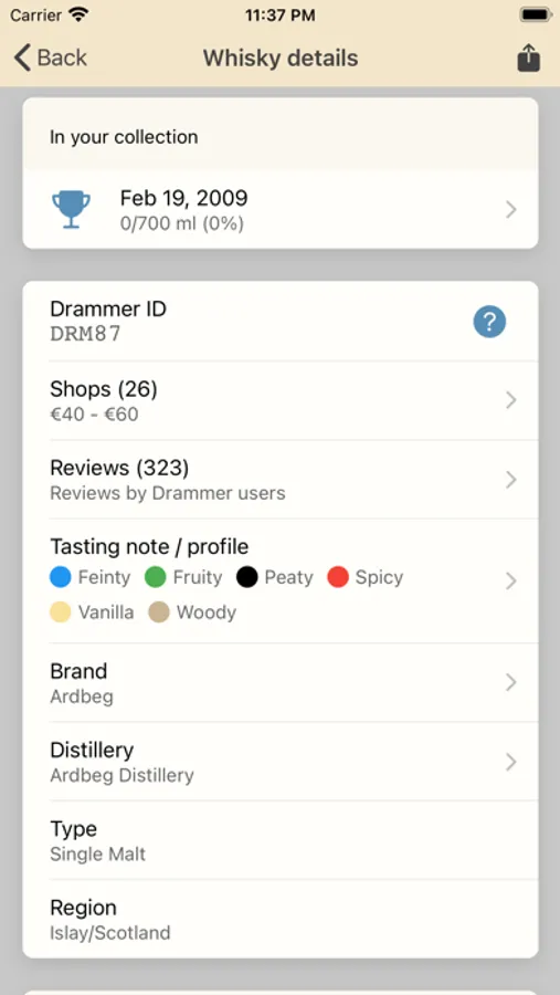 With the Drammer whisky app you easily track and share your wish list, collection and reviews. Find whisky deals, whisky news, whisky events, brand and price information.
