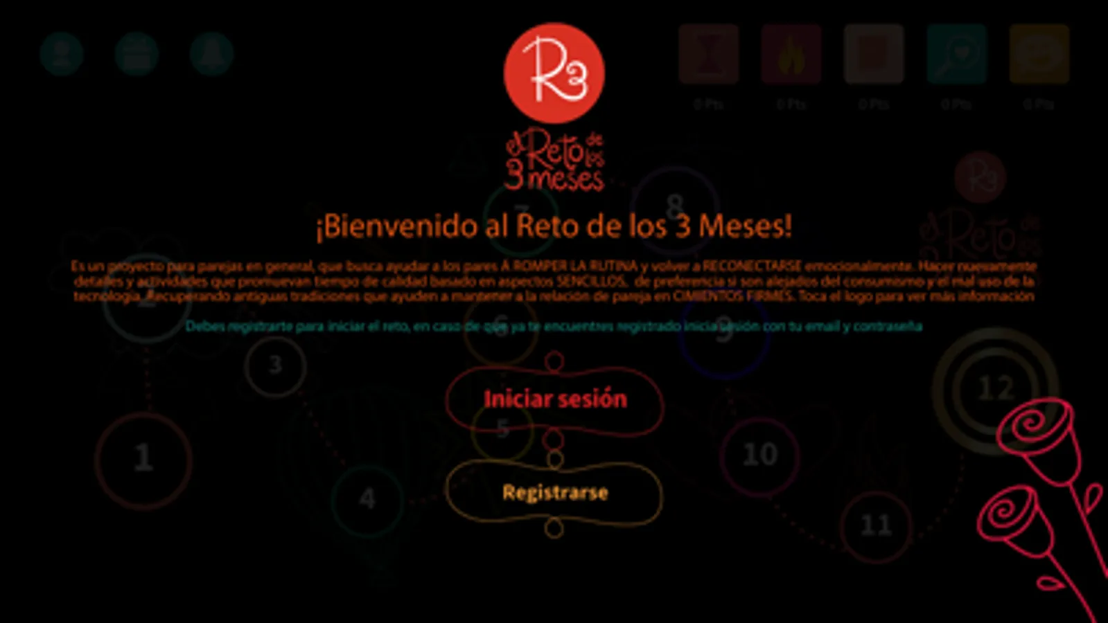 El R3 es juego para parejas, que deseen RECONECTARSE, son 12 niveles a superar, cada uno tiene 3 actividades a realizar para pasar al siguiente nivel. El reto de los 3 meses a la vez que es divertido se trabaja en 5 áreas que por lo general las parejas descuidan y el juego te ayuda a mejorar y fortalecer: COMUNICACIÓN, TIEMPO DE CALIDAD, VALORAR Y AGRADECER, CONOCERSE MEJOR, Y ROMPER LA RUTINA SEXUAL. ¿Te atreves?