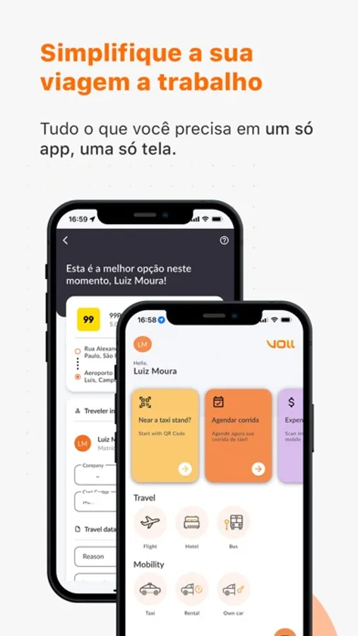 Com o app VOLL, você tem acesso às opções de transporte disponibilizadas pelos maiores aplicativos de transporte urbano, passagens aéreas, hospedagem e locadoras de carros de maneira personalizada, de acordo com seu perfil e a política de viagens de sua empresa.