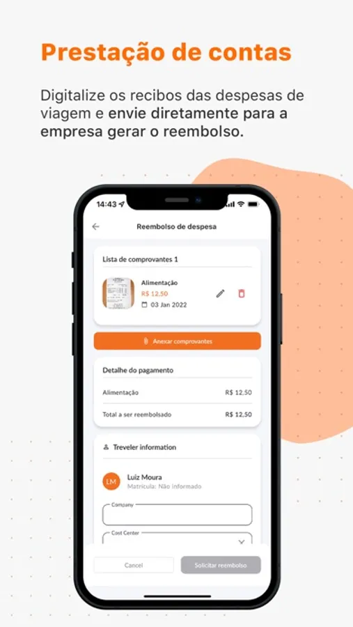 Organizar comprovantes de despesas durante a viagem é muito mais simples com o app VOLL. Alimentação, estacionamento, pedágio e outros tipos de gastos podem ser digitalizados no app e enviadas automaticamente para a sua empresa. Chega de perder tempo conferindo notinhas e calculando os valores do reembolso! O app VOLL faz tudo para você.
