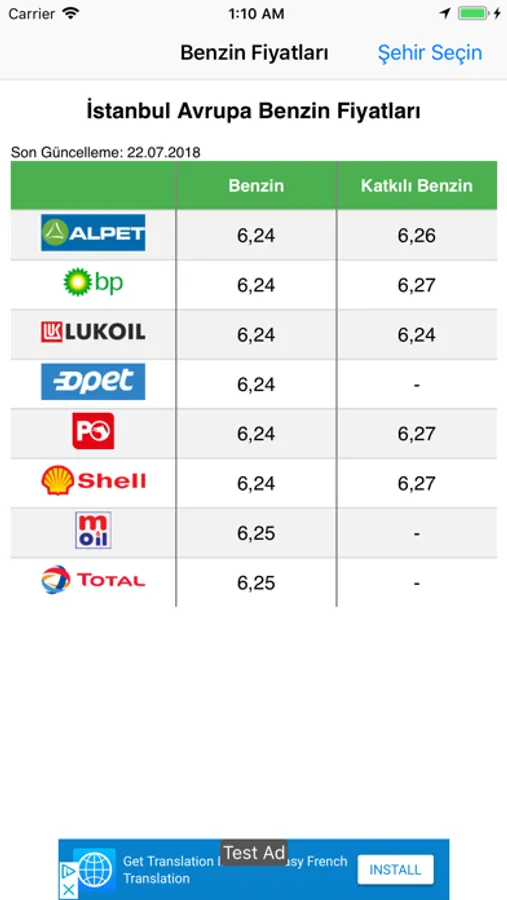 Mobil Uygulamada Benzin fiyatları en güncel haliyle yayınlamaktadır. Tüm illere ait benzin fiyatlarını, yukarda yer alan "İl Seç" butonu ile ili seçerek görebilirsiniz.