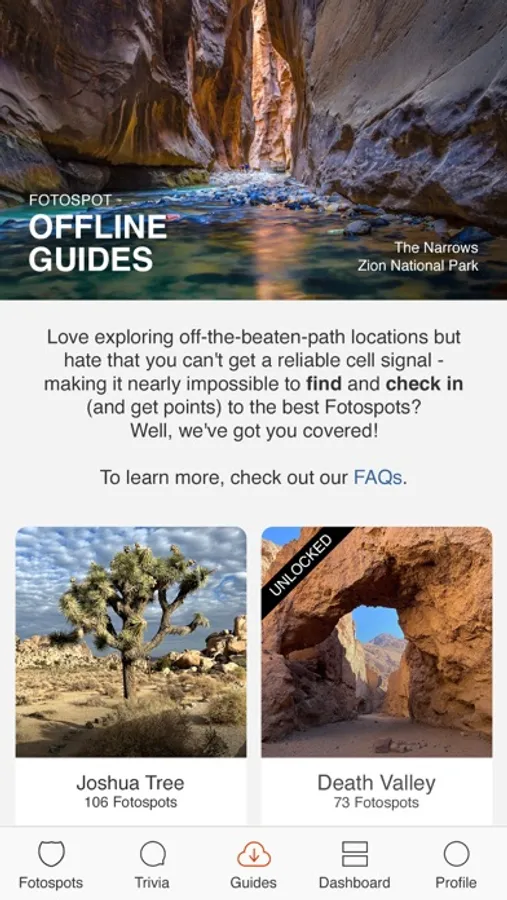 No internet? No problem! With 19 offline guides, Fotospot has you covered, even in internet dead zones like national parks, deserts, and remote locations. Say what?! You read that right, you can access our photos, content, maps, and even check-in (and get points!) with no internet connection! Available offline guides include: