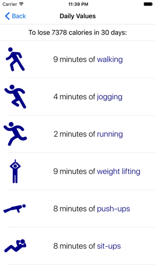 Enter your current and target weights, the start and end dates, and the amount of work you want to spend on a large variety of exercises. The application will show you how much daily work you need to do for the different exercises based on your chosen preferences.