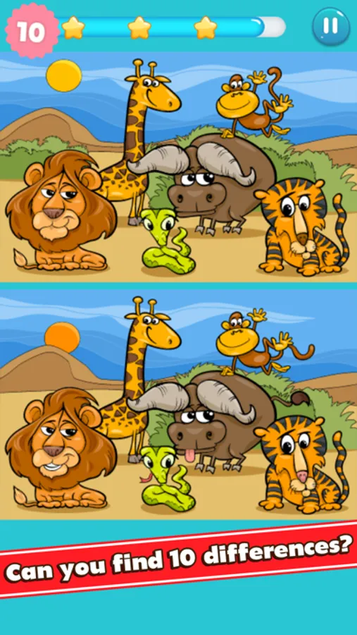 In this game, there are 24 levels in total. In each level, you see two versions of one image and have to find the 10 differences between them by touching or on these spots. There is also a timer that your final score is based on it (the highest is 3 stars). Note that wrong clicks will also reduce your time and final score, so think carefully before deciding!