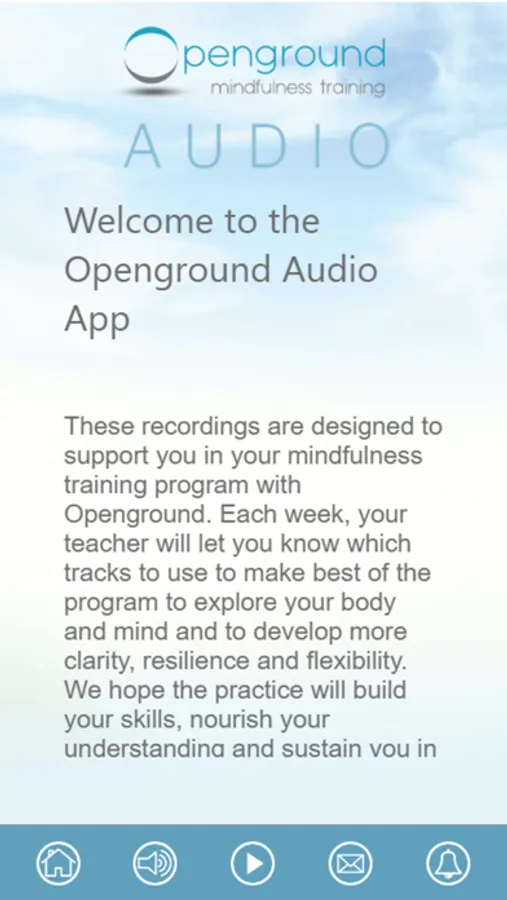 This App is designed to support the mindfulness training program with Openground. It includes audio of body scans, sitting, moving and other practices. You can also keep up to date with Mindfulness events through our notifications.