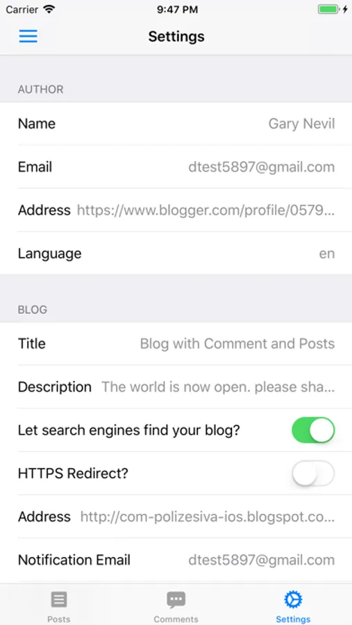 ***** The app itself does not host content on servers. It is just a third party client to Blogger.com *****
