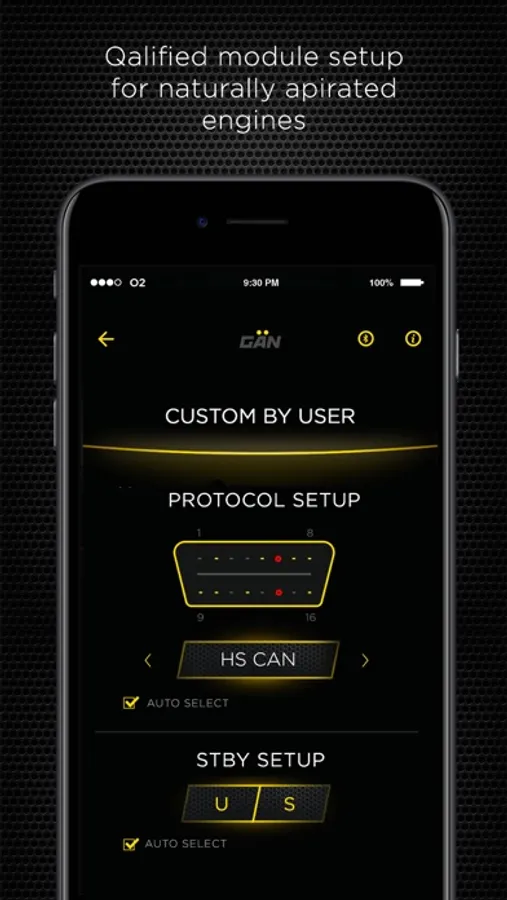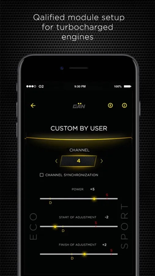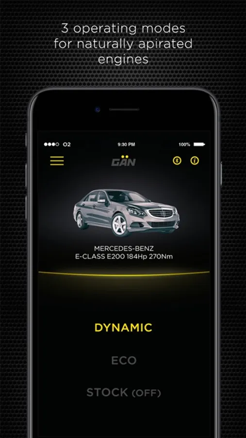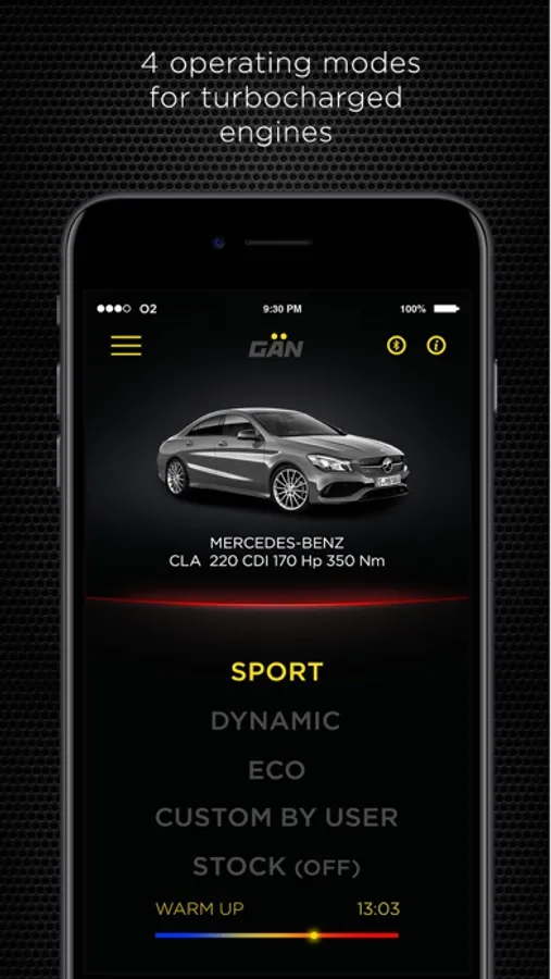 You can manage GÄN device through Bluetooth of your Smartphone with GÄN App. Some operating modes are available. You can choose from fuel saving Eco mode to the most powerful Sport mode. "Warm-up" function allows you to take care of the engine in cold seasons. Demo mode allows you to evaluate the App without purchasing the GÄN device.