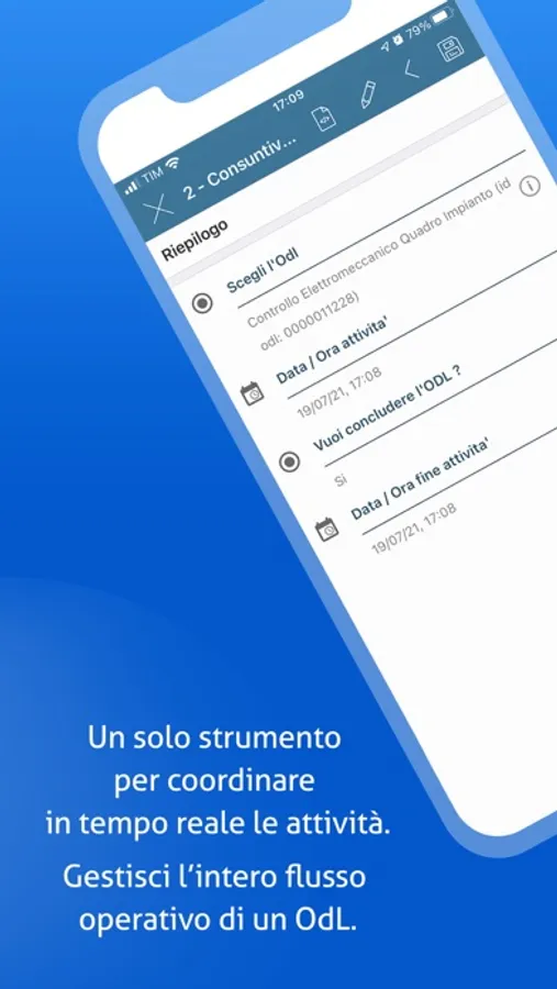 • consuntivazione di un OdL (con la possibilità di inserire dati tramite registrazione vocale, così come foto e firme di validazione).