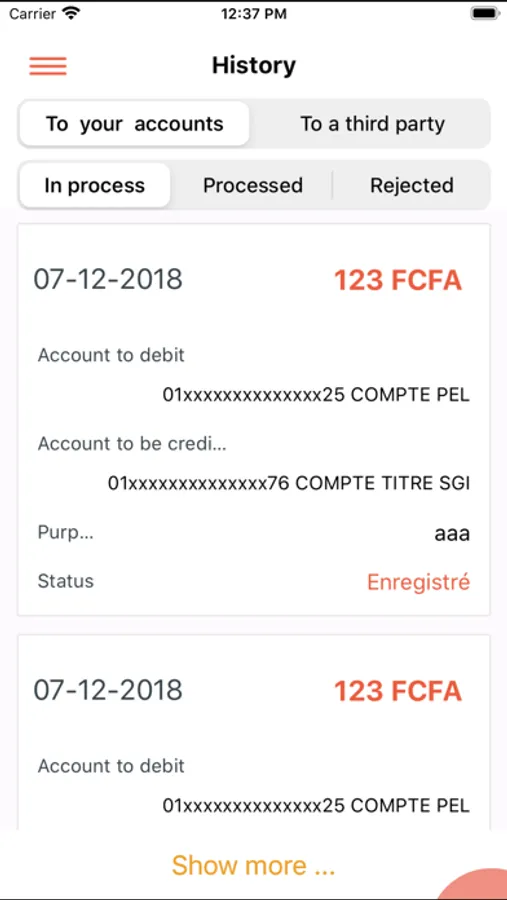 • Make and track your transfers (standard, scheduled, recurring, multiple, and salary transfers) safely within the UEMOA zone.