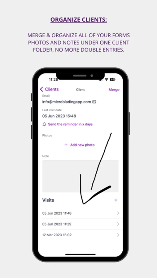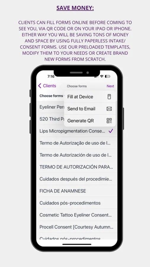 Ready-to-use templates of essential electronic consent, photo/video consent forms and medical history. Clients can just fill in and sign on the iPad. You can save, print and e-mail them.