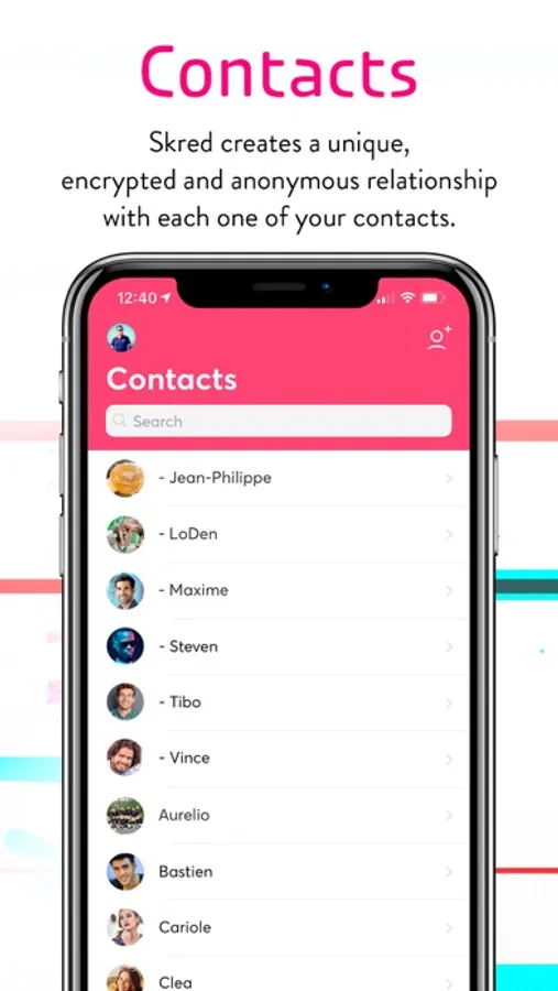 The SkredBoard, which is accessible by simply swiping down, allows for generating many identities that are separated from each other for absolute confidentiality. You can also use groups to exchange with several friends at once.