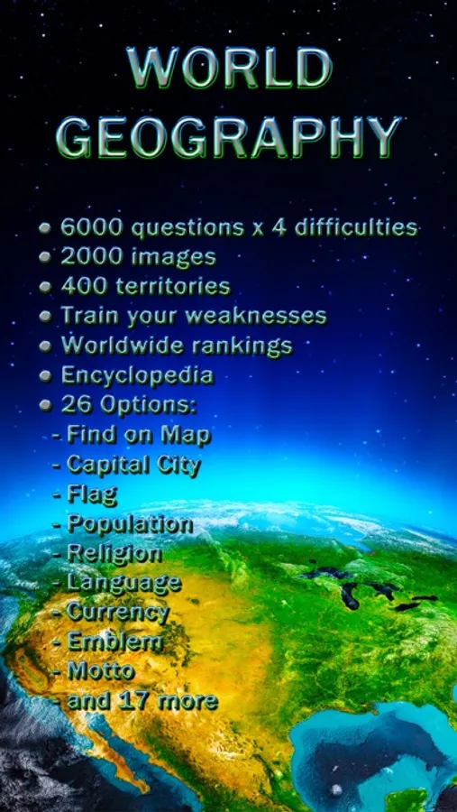 World Geography is a quiz game that will help you to learn everything about countries: maps, flags, capitals, population, languages, religion, currencies, and much more. Learn geography in an easy and fun way by competing with players from all over the world.