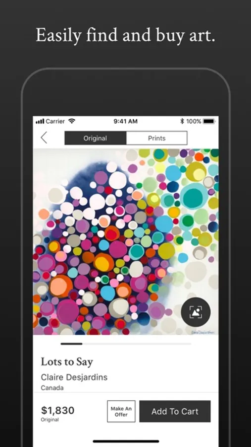 Feeling artsy? Launch our app to put a powerful art finder in the palm of your hand! Browse an unparalleled, curated selection of original paintings, photography, sculpture, drawings, and collage by artists from around the world. You can also search by artist, title, and keyword, or use sophisticated filters to target the works you're looking for. When you're ready to buy, you can pay in a flash using your credit card or Apple Pay. It's as simple as that.