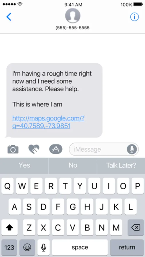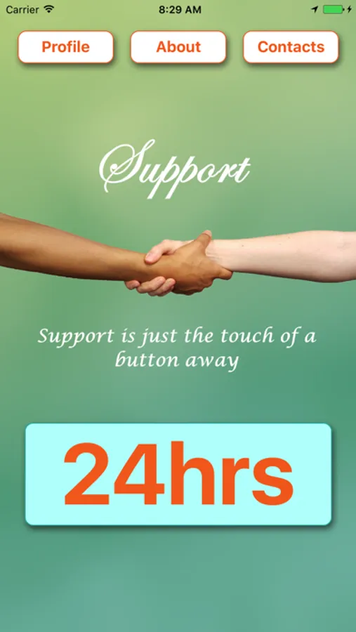 This app is a notification service that sends out a text message with your current location. Users of this app can upload their personal contacts to be notified at the click of a button. While primarily designed with suicide prevention in mind, this app can be used to notify personal contacts for any reason. Once the "24hrs" button is activated all numbers listed in the contacts section will be sent an SMS with the user's predefined message and their current location.