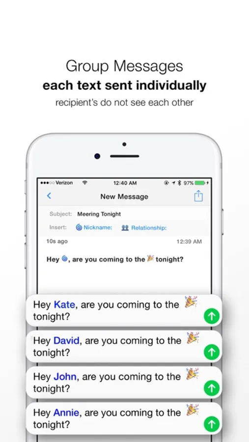 Reach is the best group texting app to communicate with people on individual level. Unlike messy group chats, Reach lets you create separate groups of people from your contacts list and send them personalized SMS or text messages, iMessages, emails, or even WhatsApp texts, effortlessly. The recipient's get a personal message from you, and do not see the other recipient's in the list.
