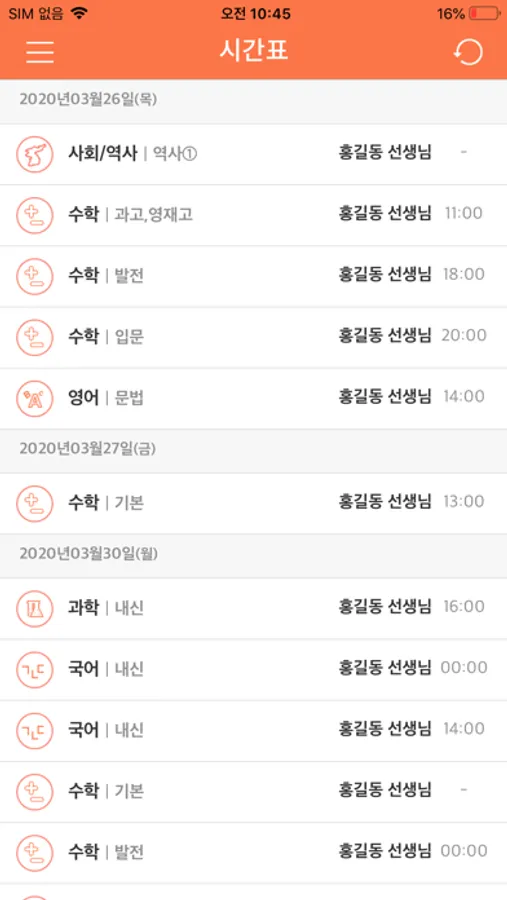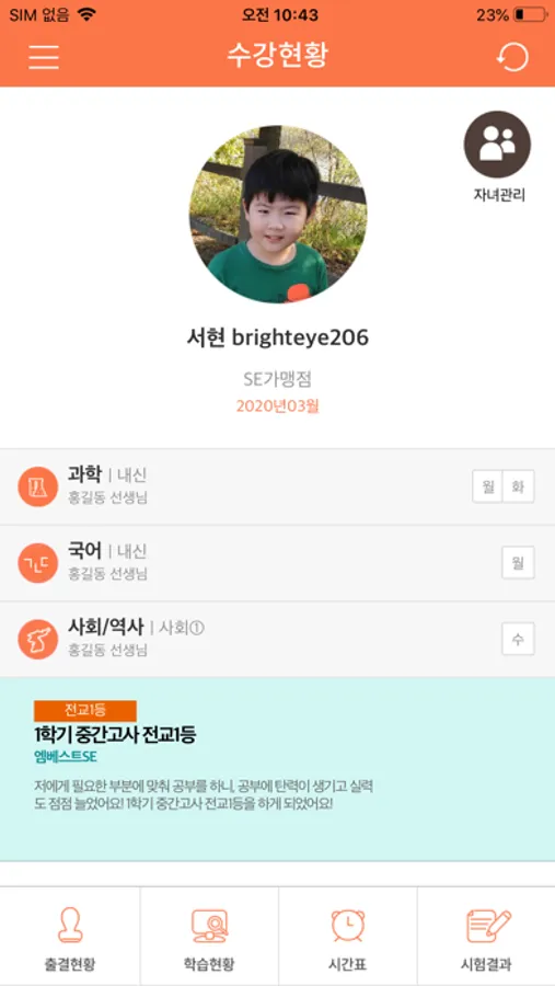 - 수강정보(메인화면) : 프로필 사진 등록, 수강 기간, 수업 과목별 수업 요일 확인