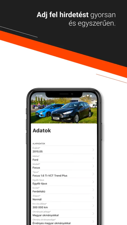 A felhasználói visszajelzések alapján egyszerűbbé és gyorsabbá tettük a hirdetésfeladást, így a mobilod segítségével pár perc alatt meghirdetheted eladásra szánt járművedet! Fotót készíthetsz, vagy korábbi képeidet feltöltheted egyenesen a telefonod galériájából, a legfontosabb adatok megadása után pedig könnyedén finomhangolhatod és jóváhagyhatod a hirdetésedet.