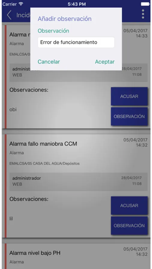 Para finalizar, el encargado puede definir las alarmas que necesite en sus procesos y dejar que nuestra tecnología le avise a través de notificaciones. Estas notificaciones quedan registradas en el terminal con información de la hora del suceso y datos acerca del mismo. Mientras el operario esté subsanando la alarma, puede seguir viendo todo el proceso, incluso parar partes desde el terminal móvil, para lograr un mantenimiento mucho más efectivo. Esto permite subsanar las incidencias en el menor intervalo de tiempo posible. Una vez revisada la alarma, se puede "acusar", para que el sistema registre que se ha revisado, creando una estadística del tiempo medio de respuesta a las incidencias que le permitirá optimizar sus recursos.