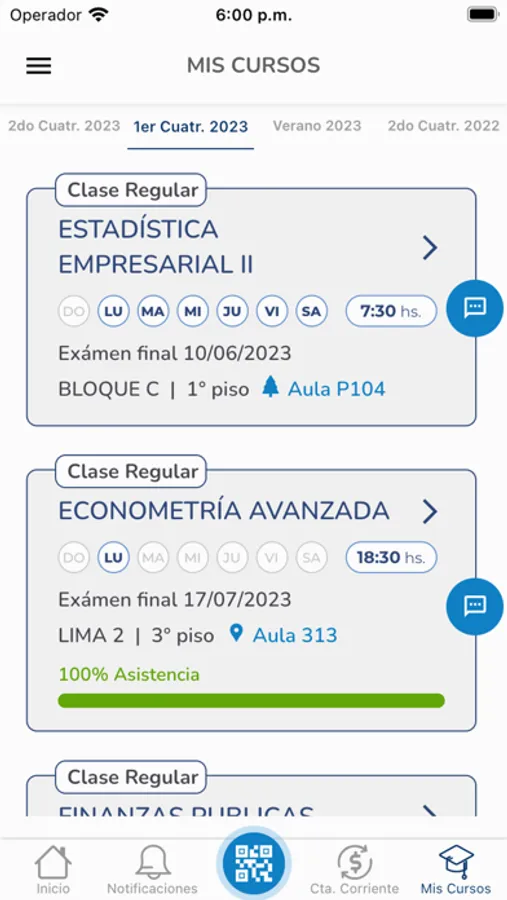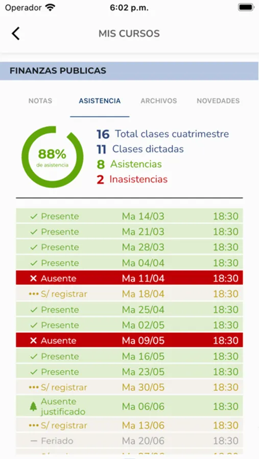 • Visualizar las materias a las que estás inscripto con sus horarios, aulas, archivos, novedades, asistencia, notas y fechas de examen.