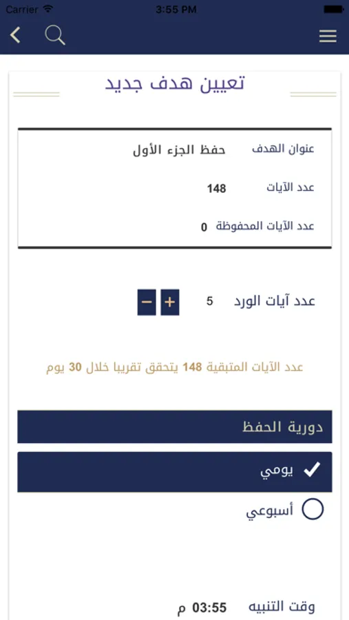 •جدول زمني لتنظيم ومتابعة حفظ القرآن الكريم مع تنبيه للتذكير بالمواعيد والآيات المحددة للحفظ يومياً.