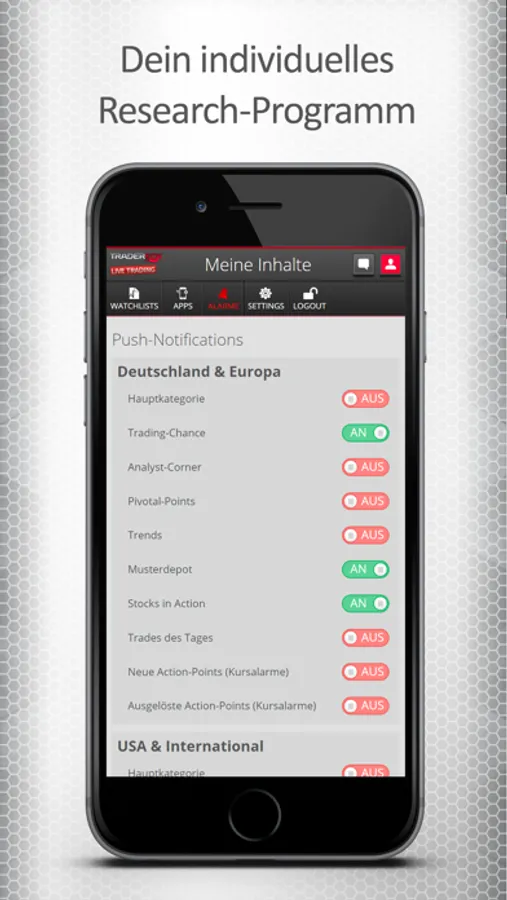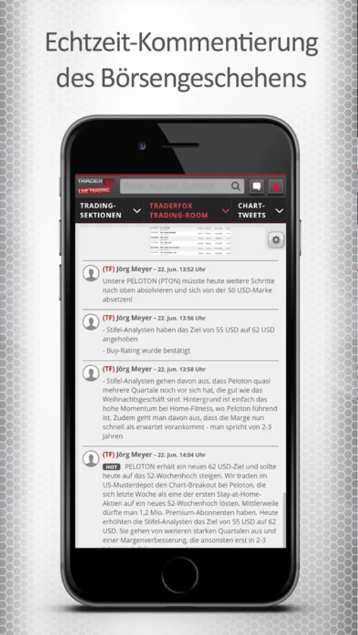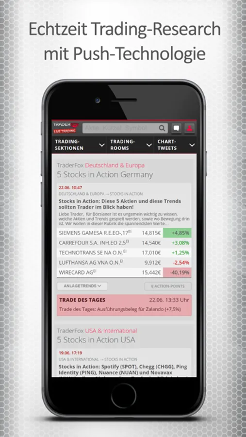 Trader erhalten mit der App direkten Zugang zu unserem Trading-Research. Unser Redaktionsteam besteht aus derzeit 5 professionellen Tradern, die den Aktienmarkt täglich von 8 bis 22 Uhr überwachen. Rund um die Uhr wollen wir unsere Kunden darüber informieren bei welchen Aktien gerade die Musik spielt.