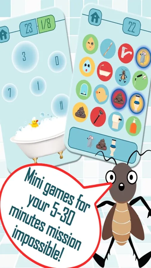 5 different mini toilet games for kids, toddlers and adults to spend an amusing time in the bathroom. Use different strategies to reach level 40!