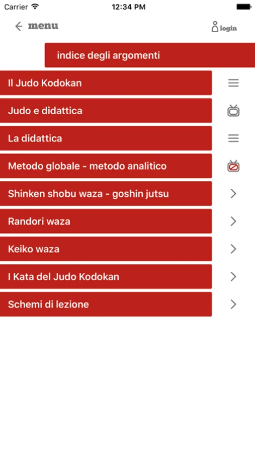 In questo modo, ad esempio se cerchi i kaeshi waza di o soto gari sarà sufficiente entrare nell'indice degli argomenti, toccare il bottone degli ashi waza, toccare o soto gari e appariranno i tutorial che ti interessano.