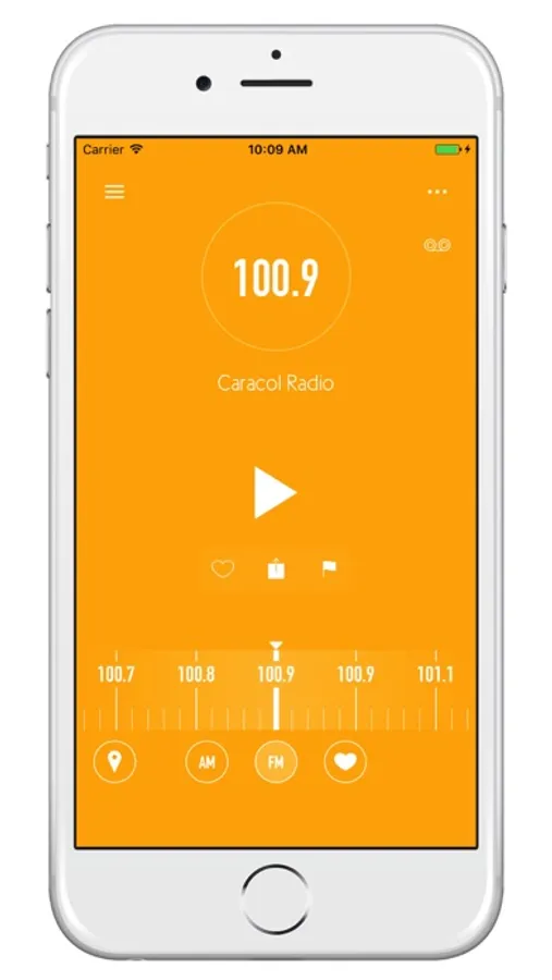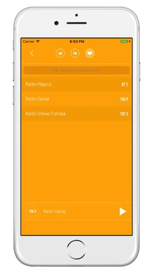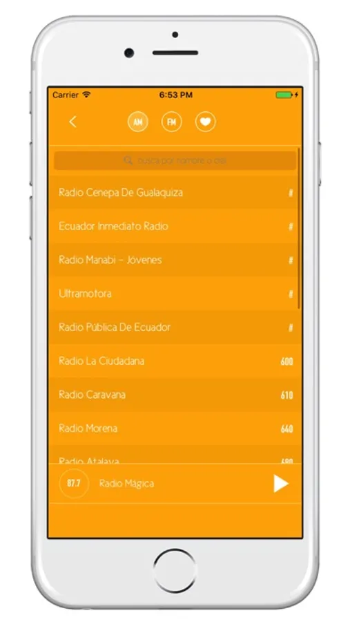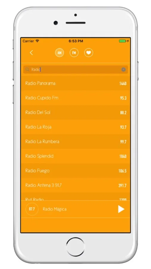 Vista en lista de las radios organizadas entre AM, FM y tus Favoritas.