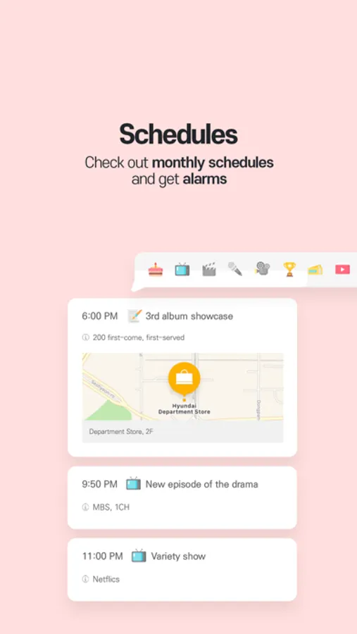 - Share the schedule within the fandom and get push alarms provided by CHOEAEDOL-Celeb.
