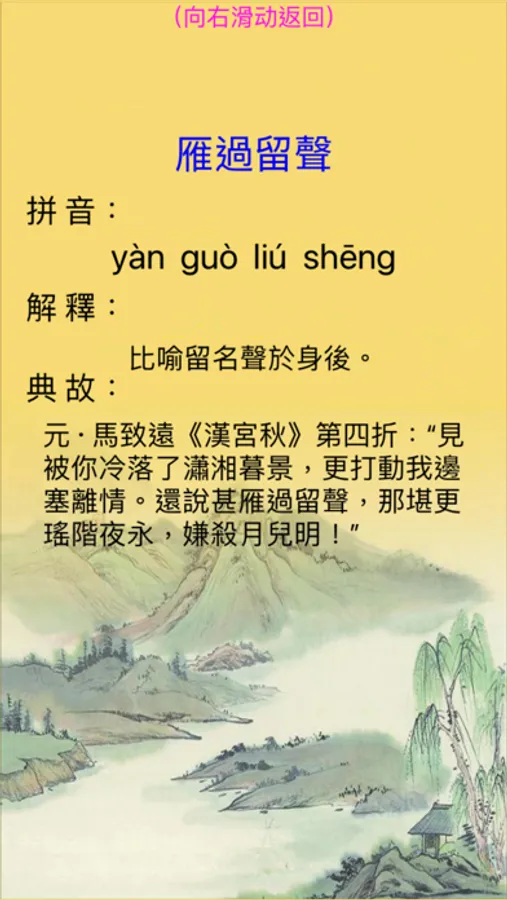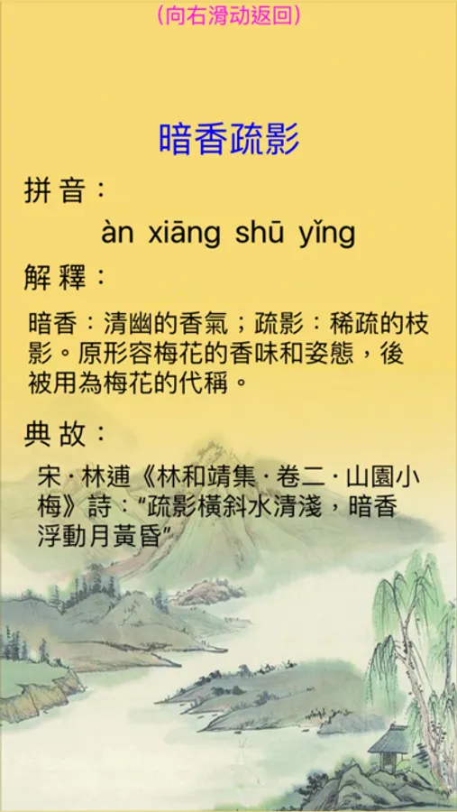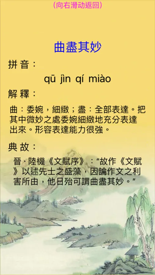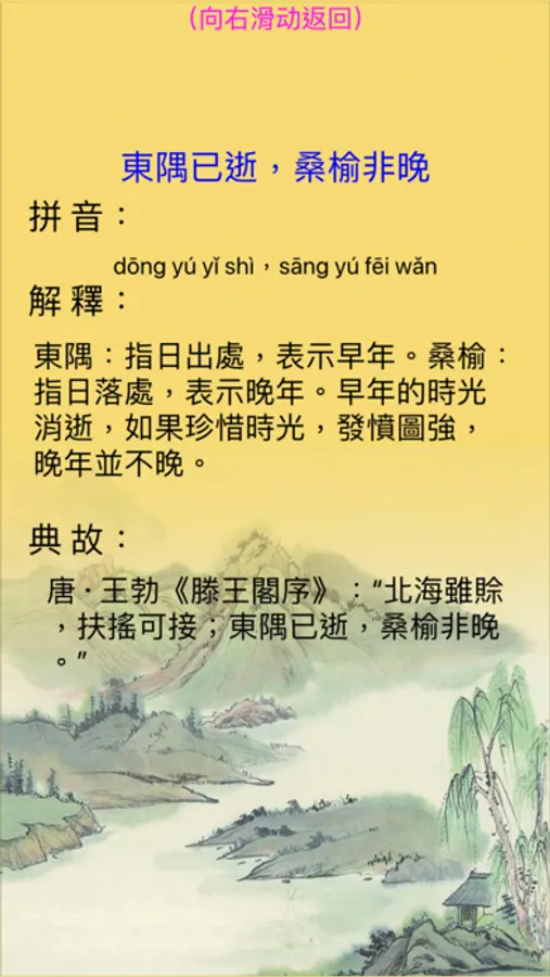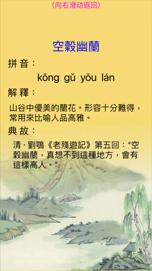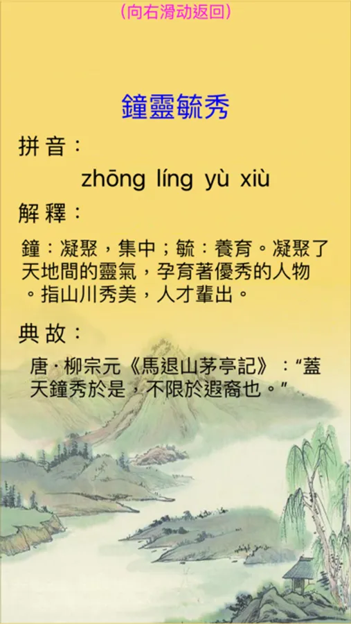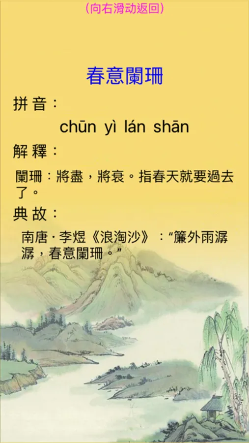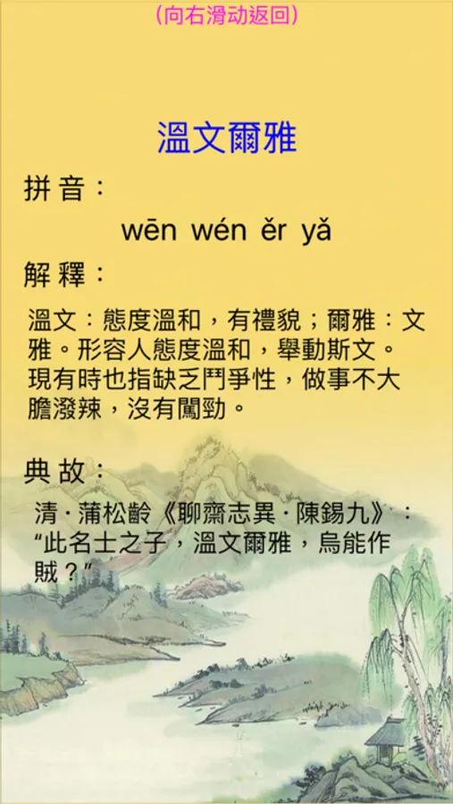 *. 成語比較全面,總共收集了31811個成語,可左右滑動翻看,給妳翻書的感覺