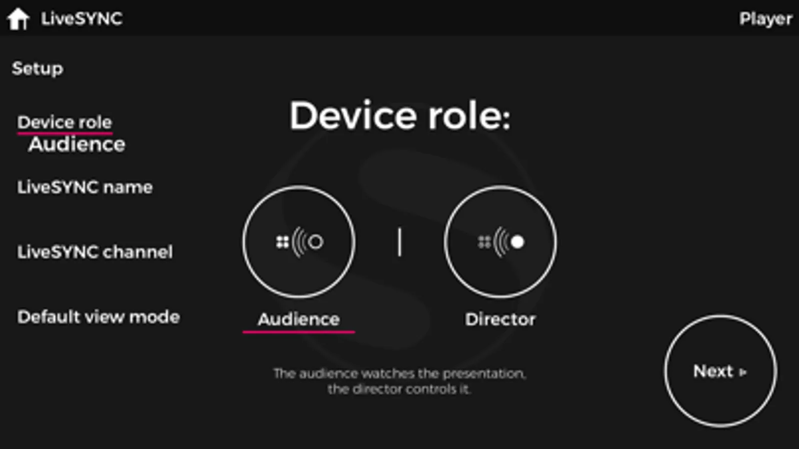 LiveSYNC is really easy to use: in the setup wizard you decide whether a device acts as the director or belongs to the audience, give a distinctive name for the device so that you can identify them, and reserve a communication channel for your presentation. After copying your media files in place you are ready to go.