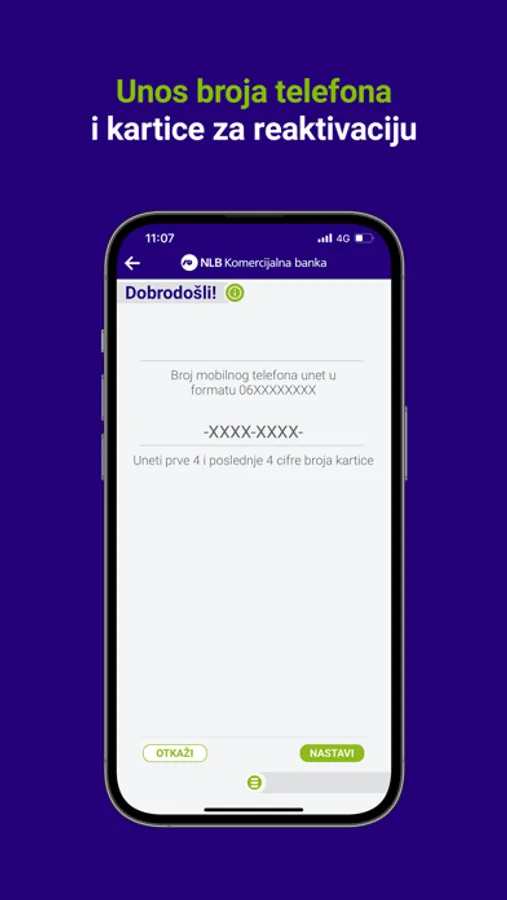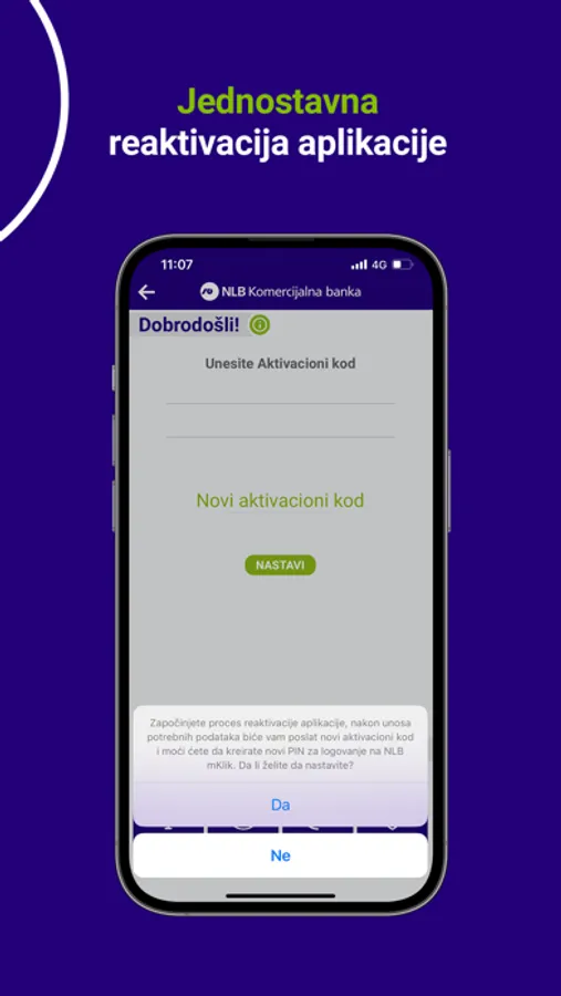 Napomena: Registrovani nalozi NLB mKlik aplikacije se mogu aktivirati ili reaktivirati iz same aplikacije. Klikom na opciju „Novi aktivacioni kod“ (na stranici za prijavljivanje) i unošenjem mobilnog telefona registrovanog za korišćenje usluge mobilnog bankarstva zajedno sa prve i poslednje četiri cifre bilo koje vaše aktivne platne kartice inicira se slanje aktivacionih kodova putem SMS-a. Slanje aktivacionih kodova se takođe može iniciratiz iz eKlik aplikacije ili pozivanje Kontakt Centra.