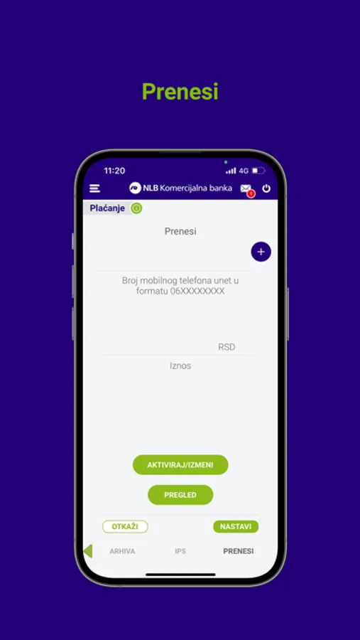 - Plaćanje putem usluge PRENESI unosom broja mobilnog telefona koji je primalac sredstava registrovao za ovu uslugu