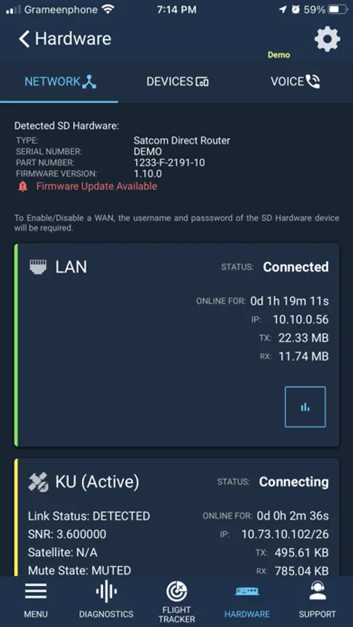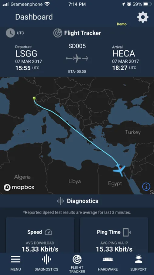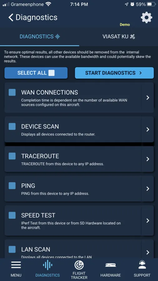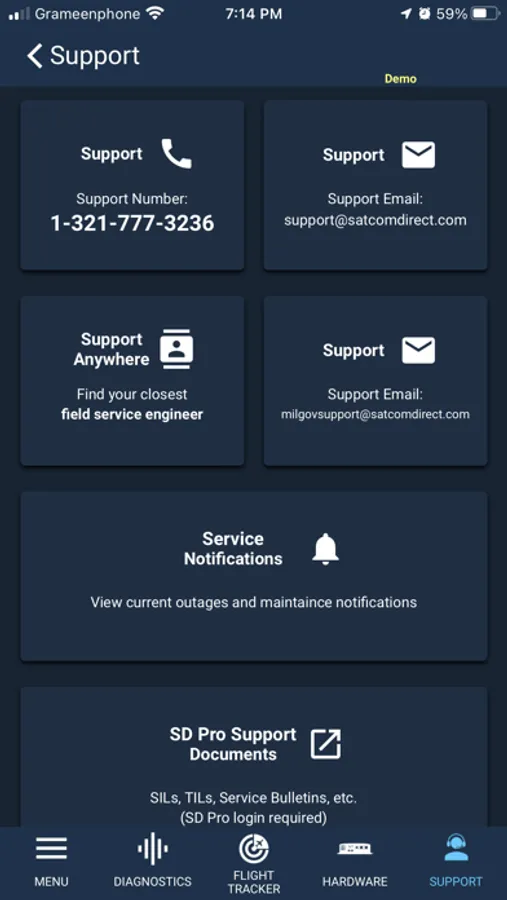 The SD Cabin app simplifies the in flight connectivity experience through seamless access to multiple key functions from a single application while on board an aircraft equipped with SD Hardware. SD Cabin dynamically detects the services activated on your aircraft and enables access to functions based on these services. SD Cabin provides trip information, device and network connectivity management, basic and advanced troubleshooting tools, plus valuable access to our award winning Satcom Direct Support team.