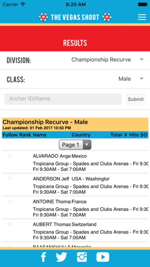 Choose your favorite athletes and receive live updated of their scores and rank.