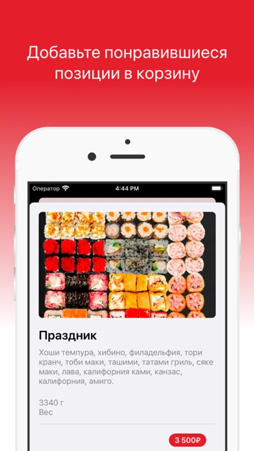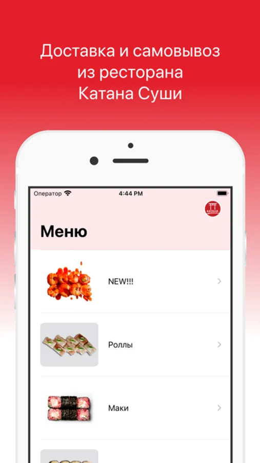Как сделать заказ в приложении “Катана Суши”: выберите понравившиеся позиции из меню, добавьте их в корзину и перейдите на экран оформления заказа (по нажатию на иконку корзины).
