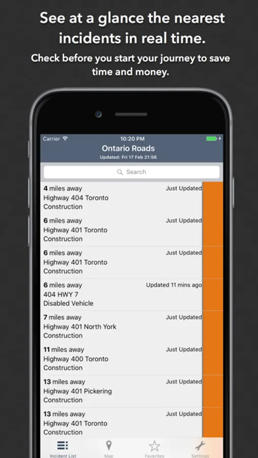 - Shows current incidents in order of distance from your current location (closest incidents are shown first).